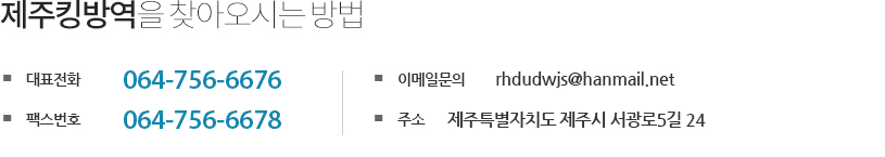 상호명 제주킹방역 | 대표명 고영전 | 사업자등록번호 754-92-00719 | TEL 064-756-6676 | FAX 064-756-6678 | ADD 제주특별자치도 제주시 서광로5길 24